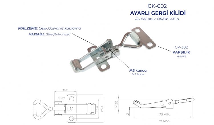 | GK-002 | Ayarlı gergi kilidi 75-95 | Galvaniz kaplamalı çelik | 75-95mm | 39.5mm | 14.5mm |