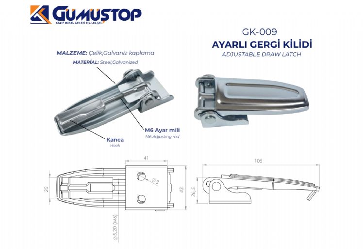 GK-009 Ayarlı gergi kilidi 105 Galvaniz kaplamalı çelik 105mm 42mm 29.6mm