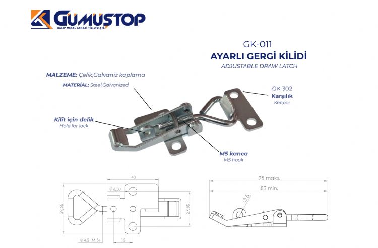 | GK-011 | Ayarlı gergi kilidi 75-95 | Galvaniz kaplamalı çelik | 75-95mm | 39.5mm | 14.5mm |